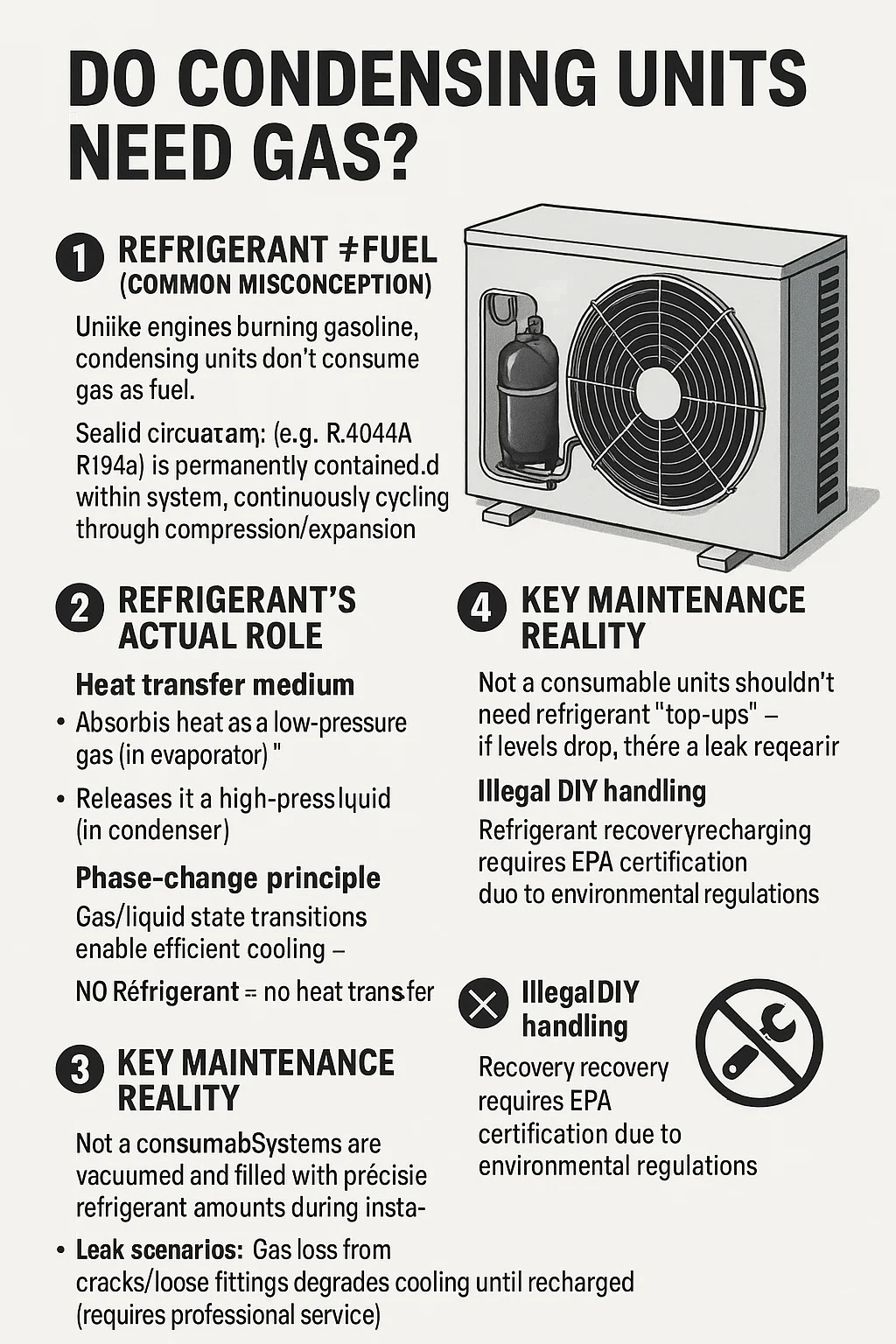 Žádný, kondenzační jednotky Sami „nepotřebují plyn“ - ale jejich chladicí obvod absolutně vyžaduje fungování plynu chladiva. Zde je kritické poruchy: