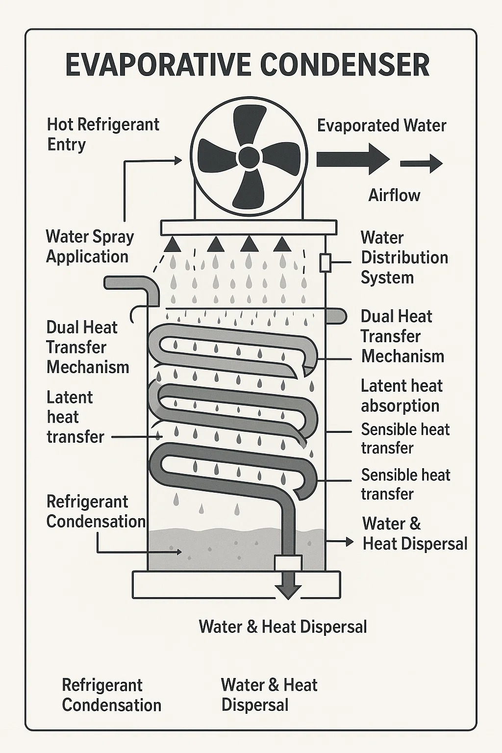 Odpařovací kondenzátory odvádějí teplo tím, že kombinují chlazení vzduchem s odpařováním vody. Na rozdíl od standardních kondenzátorů, které se spoléhají pouze na rozumný přenos tepla, využívají absorpci latentního tepla během odpařování vody.