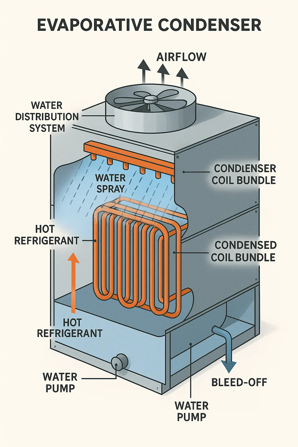 An odpařovací kondenzátor Integruje chlazení vzduchu a odpařování vody pro odmítnutí tepla z chladicích systémů. Jeho návrh a provoz se v zásadě liší od standardních vzduchem chlazených kondenzátorů: